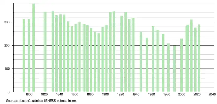L'évolution du nombre d'habitants est connue à travers les recensements de la population effectués dans la commune depuis 1793. Pour les communes de moins de 10 000 habitants, une enquête de recensement portant sur toute la population est réalisée tous les cinq ans, les populations de référence des années intermédiaires étant quant à elles estimées par interpolation ou extrapolation[22]. Pour la commune, le premier recensement exhaustif entrant dans le cadre du nouveau dispositif a été réalisé en 2007[23].