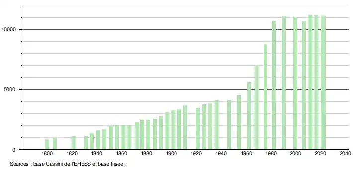 - ↑ Par convention dans Wikipédia, le principe a été retenu de n’afficher dans le tableau des recensements et le graphique, pour les populations de référence postérieures à 1999, que les populations correspondant à une enquête exhaustive de recensement pour les communes de moins de 10 000 habitants, et que les populations des années 2006, 2011, 2016, etc. pour les communes de plus de 10 000 habitants, ainsi que la dernière population de référence publiée par l’Insee pour l'ensemble des communes.