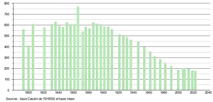 L'évolution du nombre d'habitants est connue à travers les recensements de la population effectués dans la commune depuis 1793. Pour les communes de moins de 10 000 habitants, une enquête de recensement portant sur toute la population est réalisée tous les cinq ans, les populations de référence des années intermédiaires étant quant à elles estimées par interpolation ou extrapolation[13]. Pour la commune, le premier recensement exhaustif entrant dans le cadre du nouveau dispositif a été réalisé en 2008[14].