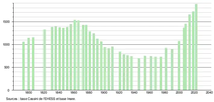 L'évolution du nombre d'habitants est connue à travers les recensements de la population effectués dans la commune depuis 1793. Pour les communes de moins de 10 000 habitants, une enquête de recensement portant sur toute la population est réalisée tous les cinq ans, les populations de référence des années intermédiaires étant quant à elles estimées par interpolation ou extrapolation[17]. Pour la commune, le premier recensement exhaustif entrant dans le cadre du nouveau dispositif a été réalisé en 2008[18].