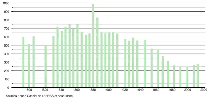 L'évolution du nombre d'habitants est connue à travers les recensements de la population effectués dans la commune depuis 1793. À partir du , les populations légales des communes sont publiées annuellement dans le cadre d'un recensement qui repose désormais sur une collecte d'information annuelle, concernant successivement tous les territoires communaux au cours d'une période de cinq ans. Pour les communes de moins de 10 000 habitants, une enquête de recensement portant sur toute la population est réalisée tous les cinq ans, les populations légales des années intermédiaires étant quant à elles estimées par interpolation ou extrapolation[2]. Pour la commune, le premier recensement exhaustif entrant dans le cadre du nouveau dispositif a été réalisé en 2007[3],[Note 1].