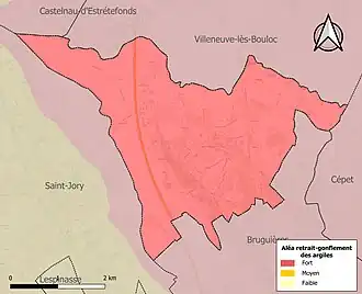 La commune est vulnérable au risque de mouvements de terrains constitué principalement du retrait-gonflement des sols argileux[24]. Cet aléa est susceptible d'engendrer des dommages importants aux bâtiments en cas d’alternance de périodes de sécheresse et de pluie. La totalité de la commune est en aléa moyen ou fort (88,8 % au niveau départemental et 48,5 % au niveau national). Sur les 647 bâtiments dénombrés sur la commune en 2019, 647 sont en aléa moyen ou fort, soit 100 %, à comparer aux 98 % au niveau départemental et 54 % au niveau national. Une cartographie de l'exposition du territoire national au retrait gonflement des sols argileux est disponible sur le site du BRGM[25],[Carte 3].