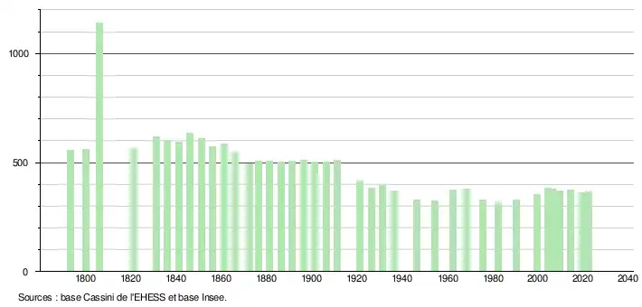 - ↑ Fiches Insee - Populations de référence de la commune pour les années 2006, 2007, 2008, 2009, 2010, 2011, 2012, 2013, 2014, 2015, 2016, 2017, 2018, 2019, 2020, 2021 et 2022.
