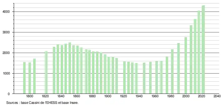 L'évolution du nombre d'habitants est connue à travers les recensements de la population effectués dans la commune depuis 1793. Pour les communes de moins de 10 000 habitants, une enquête de recensement portant sur toute la population est réalisée tous les cinq ans, les populations de référence des années intermédiaires étant quant à elles estimées par interpolation ou extrapolation[22]. Pour la commune, le premier recensement exhaustif entrant dans le cadre du nouveau dispositif a été réalisé en 2006[23].