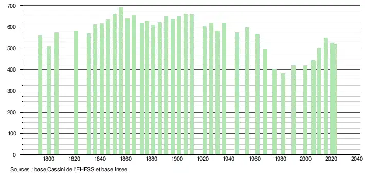 L'évolution du nombre d'habitants est connue à travers les recensements de la population effectués dans la commune depuis 1793. Pour les communes de moins de 10 000 habitants, une enquête de recensement portant sur toute la population est réalisée tous les cinq ans, les populations de référence des années intermédiaires étant quant à elles estimées par interpolation ou extrapolation[23]. Pour la commune, le premier recensement exhaustif entrant dans le cadre du nouveau dispositif a été réalisé en 2005[24].