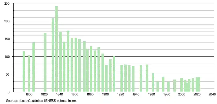 L'évolution du nombre d'habitants est connue à travers les recensements de la population effectués dans la commune depuis 1793. Pour les communes de moins de 10 000 habitants, une enquête de recensement portant sur toute la population est réalisée tous les cinq ans, les populations de référence des années intermédiaires étant quant à elles estimées par interpolation ou extrapolation[24]. Pour la commune, le premier recensement exhaustif entrant dans le cadre du nouveau dispositif a été réalisé en 2004[25].