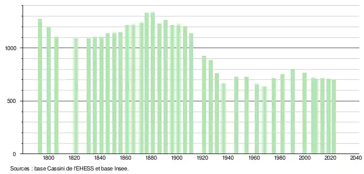 L'évolution du nombre d'habitants est connue à travers les recensements de la population effectués dans la commune depuis 1793. Pour les communes de moins de 10 000 habitants, une enquête de recensement portant sur toute la population est réalisée tous les cinq ans, les populations de référence des années intermédiaires étant quant à elles estimées par interpolation ou extrapolation[25]. Pour la commune, le premier recensement exhaustif entrant dans le cadre du nouveau dispositif a été réalisé en 2008[26].