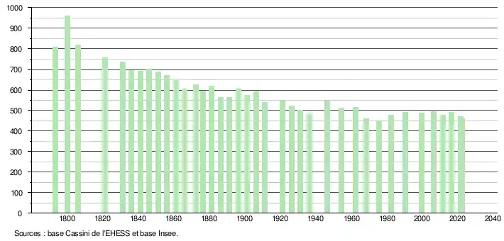 - ↑ Population municipale de référence en vigueur au 1er janvier 2025, millésimée 2022, définie dans les limites territoriales en vigueur au 1er janvier 2024, date de référence statistique : 1er janvier 2022.