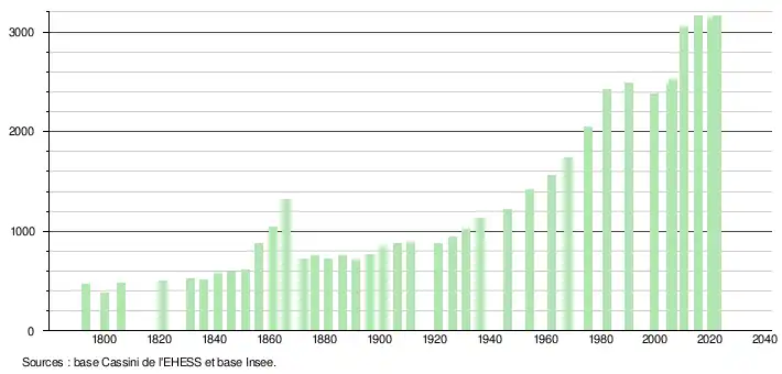 L'évolution du nombre d'habitants est connue à travers les recensements de la population effectués dans la commune depuis 1793. Pour les communes de moins de 10 000 habitants, une enquête de recensement portant sur toute la population est réalisée tous les cinq ans, les populations de référence des années intermédiaires étant quant à elles estimées par interpolation ou extrapolation[30]. Pour la commune, le premier recensement exhaustif entrant dans le cadre du nouveau dispositif a été réalisé en 2005[31].