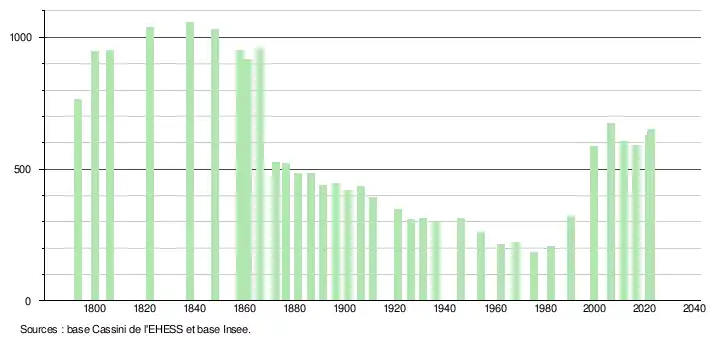 L'évolution du nombre d'habitants est connue à travers les recensements de la population effectués dans la commune depuis 1793. Pour les communes de moins de 10 000 habitants, une enquête de recensement portant sur toute la population est réalisée tous les cinq ans, les populations de référence des années intermédiaires étant quant à elles estimées par interpolation ou extrapolation[11]. Pour la commune, le premier recensement exhaustif entrant dans le cadre du nouveau dispositif a été réalisé en 2006[12].