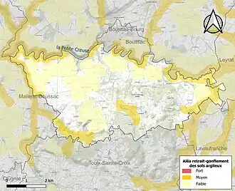 Le retrait-gonflement des sols argileux est susceptible d'engendrer des dommages importants aux bâtiments en cas d’alternance de périodes de sécheresse et de pluie. 17,4 % de la superficie communale est en aléa moyen ou fort (33,6 % au niveau départemental et 48,5 % au niveau national). Sur les 295 bâtiments dénombrés sur la commune en 2019, 16 sont en aléa moyen ou fort, soit 5 %, à comparer aux 25 % au niveau départemental et 54 % au niveau national. Une cartographie de l'exposition du territoire national au retrait gonflement des sols argileux est disponible sur le site du BRGM[16],[Carte 2].