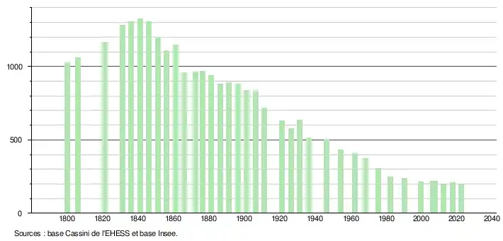 L'évolution du nombre d'habitants est connue à travers les recensements de la population effectués dans la commune depuis 1800. Pour les communes de moins de 10 000 habitants, une enquête de recensement portant sur toute la population est réalisée tous les cinq ans, les populations de référence des années intermédiaires étant quant à elles estimées par interpolation ou extrapolation[18]. Pour la commune, le premier recensement exhaustif entrant dans le cadre du nouveau dispositif a été réalisé en 2007[19].