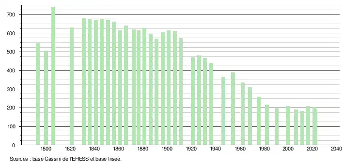 L'évolution du nombre d'habitants est connue à travers les recensements de la population effectués dans la commune depuis 1793. Pour les communes de moins de 10 000 habitants, une enquête de recensement portant sur toute la population est réalisée tous les cinq ans, les populations de référence des années intermédiaires étant quant à elles estimées par interpolation ou extrapolation[17]. Pour la commune, le premier recensement exhaustif entrant dans le cadre du nouveau dispositif a été réalisé en 2006[18].