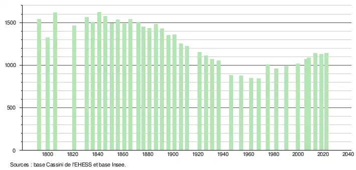 L'évolution du nombre d'habitants est connue à travers les recensements de la population effectués dans la commune depuis 1793. Pour les communes de moins de 10 000 habitants, une enquête de recensement portant sur toute la population est réalisée tous les cinq ans, les populations de référence des années intermédiaires étant quant à elles estimées par interpolation ou extrapolation[15]. Pour la commune, le premier recensement exhaustif entrant dans le cadre du nouveau dispositif a été réalisé en 2008[16].