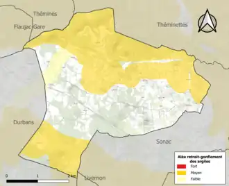 Le retrait-gonflement des sols argileux est susceptible d'engendrer des dommages importants aux bâtiments en cas d’alternance de périodes de sécheresse et de pluie. 51,6 % de la superficie communale est en aléa moyen ou fort (67,7 % au niveau départemental et 48,5 % au niveau national). Sur les 122 bâtiments dénombrés sur la commune en 2019, 14 sont en aléa moyen ou fort, soit 11 %, à comparer aux 72 % au niveau départemental et 54 % au niveau national. Une cartographie de l'exposition du territoire national au retrait gonflement des sols argileux est disponible sur le site du BRGM[24],[Carte 2].