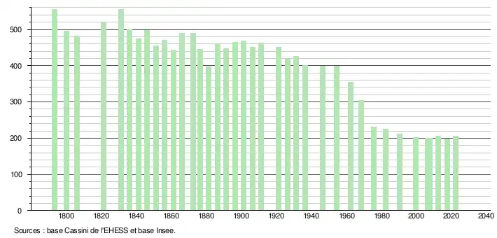 L'évolution du nombre d'habitants est connue à travers les recensements de la population effectués dans la commune depuis 1793. Pour les communes de moins de 10 000 habitants, une enquête de recensement portant sur toute la population est réalisée tous les cinq ans, les populations de référence des années intermédiaires étant quant à elles estimées par interpolation ou extrapolation[21]. Pour la commune, le premier recensement exhaustif entrant dans le cadre du nouveau dispositif a été réalisé en 2007[22].
