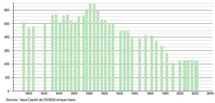 L'évolution du nombre d'habitants est connue à travers les recensements de la population effectués dans la commune depuis 1793. Pour les communes de moins de 10 000 habitants, une enquête de recensement portant sur toute la population est réalisée tous les cinq ans, les populations de référence des années intermédiaires étant quant à elles estimées par interpolation ou extrapolation[15]. Pour la commune, le premier recensement exhaustif entrant dans le cadre du nouveau dispositif a été réalisé en 2005[16].