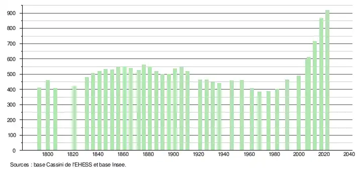 L'évolution du nombre d'habitants est connue à travers les recensements de la population effectués dans la commune depuis 1793. Pour les communes de moins de 10 000 habitants, une enquête de recensement portant sur toute la population est réalisée tous les cinq ans, les populations de référence des années intermédiaires étant quant à elles estimées par interpolation ou extrapolation[22]. Pour la commune, le premier recensement exhaustif entrant dans le cadre du nouveau dispositif a été réalisé en 2007[23].