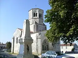 Si cette église est citée pour la première fois en 1047, l'essentiel du sanctuaire actuel date du XIIe siècle[30]. De cette époque date le portail occidental, de style roman saintongeais. Celui-ci comporte plusieurs voussures ornées notamment d'oiseaux et de grappes de raisin. De part et d'autre du portail, deux sculptures représentant des lions dévorant des damnés qui y sont représentés : ce type de représentations se retrouve dans plusieurs églises voisines, telles celles de Nieul-lès-Saintes ou La Clisse. La partie supérieure de la façade, percée d'une baie, est dépourvue de toute ornementation. Au XIIIe siècle ou XIVe siècle, l'église est reprise dans le style gothique : de cette époque datent le clocher octogonal ainsi que la chapelle sud du transept, qui est venue remplacer l'absidiole originelle. Au XVIIe siècle, de nouvelles modifications ont été apportées à la structure de l'édifice, notamment par la reconstruction de l'abside et d'une partie du croisillon nord[31].