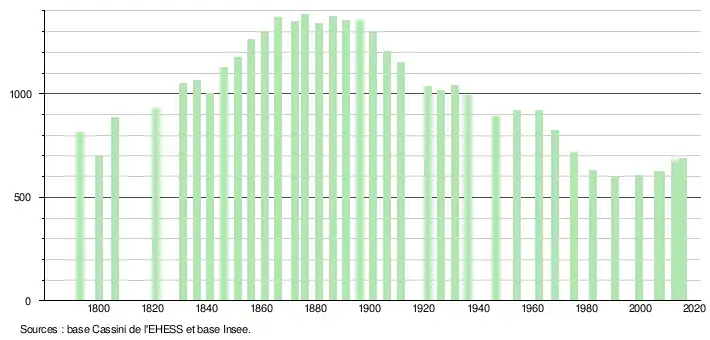 L'évolution du nombre d'habitants est connue à travers les recensements de la population effectués dans la commune depuis 1793. Pour les communes de moins de 10 000 habitants, une enquête de recensement portant sur toute la population est réalisée tous les cinq ans, les populations de référence des années intermédiaires étant quant à elles estimées par interpolation ou extrapolation[13]. Pour la commune, le premier recensement exhaustif entrant dans le cadre du nouveau dispositif a été réalisé en 2007[14].