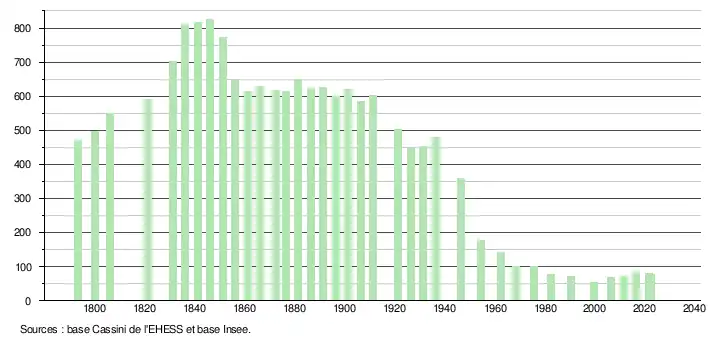 | L'évolution du nombre d'habitants est connue à travers les recensements de la population effectués dans la commune depuis 1793. Pour les communes de moins de 10 000 habitants, une enquête de recensement portant sur toute la population est réalisée tous les cinq ans, les populations de référence des années intermédiaires étant quant à elles estimées par interpolation ou extrapolation[19]. Pour la commune, le premier recensement exhaustif entrant dans le cadre du nouveau dispositif a été réalisé en 2006[20]. En 2022, la commune comptait 78 habitants[Note 1], en évolution de −7,14 % par rapport à 2016 (Corrèze : −0,59 %, France hors Mayotte : +2,11 %). |