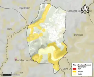 Le retrait-gonflement des sols argileux est susceptible d'engendrer des dommages importants aux bâtiments en cas d’alternance de périodes de sécheresse et de pluie. 29,8% de la superficie communale est en aléa moyen ou fort (67,7% au niveau départemental et 48,5% au niveau national). Sur les 121 bâtiments dénombrés sur la commune en 2019, 20 sont en aléa moyen ou fort, soit 17%, à comparer aux 72% au niveau départemental et 54% au niveau national. Une cartographie de l'exposition du territoire national au retrait gonflement des sols argileux est disponible sur le site du BRGM[31],[Carte 2].