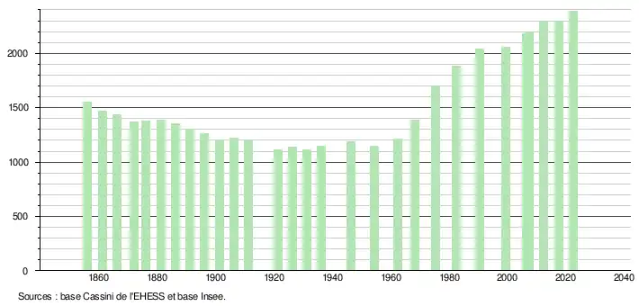 | L'évolution du nombre d'habitants est connue à travers les recensements de la population effectués dans la commune depuis 1856. Pour les communes de moins de 10 000 habitants, une enquête de recensement portant sur toute la population est réalisée tous les cinq ans, les populations de référence des années intermédiaires étant quant à elles estimées par interpolation ou extrapolation[27]. Pour la commune, le premier recensement exhaustif entrant dans le cadre du nouveau dispositif a été réalisé en 2007[28]. En 2022, la commune comptait 2 388 habitants[Note 7], en évolution de +4,23 % par rapport à 2016 (Lot-et-Garonne : −0,18 %, France hors Mayotte : +2,11 %). |