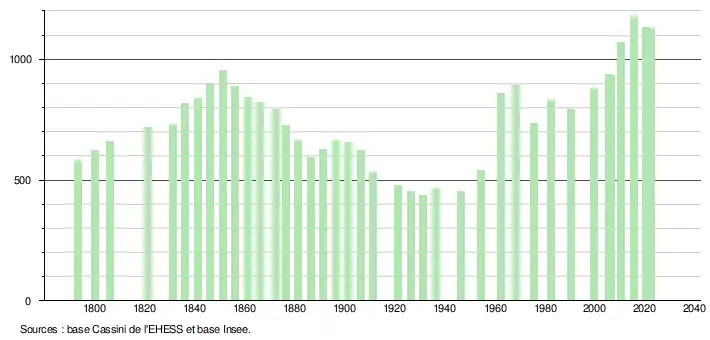 L'évolution du nombre d'habitants est connue à travers les recensements de la population effectués dans la commune depuis 1793. Pour les communes de moins de 10 000 habitants, une enquête de recensement portant sur toute la population est réalisée tous les cinq ans, les populations de référence des années intermédiaires étant quant à elles estimées par interpolation ou extrapolation[17]. Pour la commune, le premier recensement exhaustif entrant dans le cadre du nouveau dispositif a été réalisé en 2005[18].