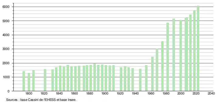 L'évolution du nombre d'habitants est connue à travers les recensements de la population effectués dans la commune depuis 1793. Pour les communes de moins de 10 000 habitants, une enquête de recensement portant sur toute la population est réalisée tous les cinq ans, les populations de référence des années intermédiaires étant quant à elles estimées par interpolation ou extrapolation[20]. Pour la commune, le premier recensement exhaustif entrant dans le cadre du nouveau dispositif a été réalisé en 2007[21].