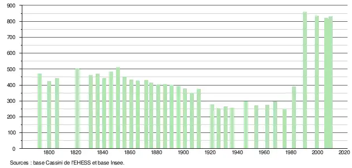 - ↑ Par convention dans Wikipédia, le principe a été retenu de n’afficher dans le tableau des recensements et le graphique, pour les populations légales postérieures à 1999, que les populations correspondant à une enquête exhaustive de recensement pour les communes de moins de 10 000 habitants, et que les populations des années 2006, 2011, 2016, etc. pour les communes de plus de 10 000 habitants, ainsi que la dernière population légale publiée par l’Insee pour l'ensemble des communes.