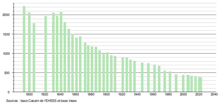 L'évolution du nombre d'habitants est connue à travers les recensements de la population effectués dans la commune depuis 1793. Pour les communes de moins de 10 000 habitants, une enquête de recensement portant sur toute la population est réalisée tous les cinq ans, les populations de référence des années intermédiaires étant quant à elles estimées par interpolation ou extrapolation[24]. Pour la commune, le premier recensement exhaustif entrant dans le cadre du nouveau dispositif a été réalisé en 2005[25].