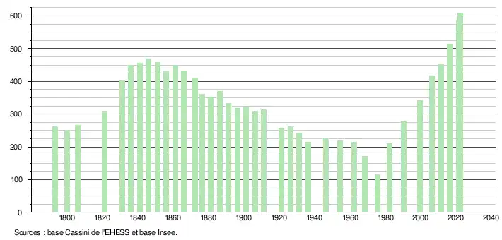 L'évolution du nombre d'habitants est connue à travers les recensements de la population effectués dans la commune depuis 1793. Pour les communes de moins de 10 000 habitants, une enquête de recensement portant sur toute la population est réalisée tous les cinq ans, les populations de référence des années intermédiaires étant quant à elles estimées par interpolation ou extrapolation[14]. Pour la commune, le premier recensement exhaustif entrant dans le cadre du nouveau dispositif a été réalisé en 2006[15].