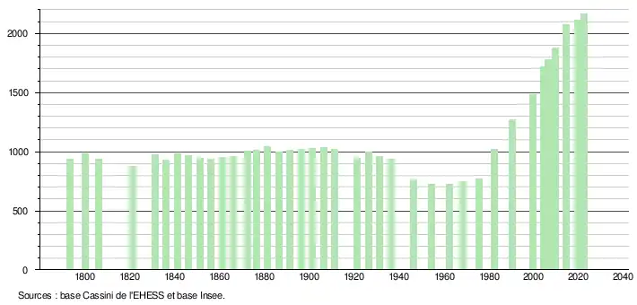 L'évolution du nombre d'habitants est connue à travers les recensements de la population effectués dans la commune depuis 1793. Pour les communes de moins de 10 000 habitants, une enquête de recensement portant sur toute la population est réalisée tous les cinq ans, les populations de référence des années intermédiaires étant quant à elles estimées par interpolation ou extrapolation[30]. Pour la commune, le premier recensement exhaustif entrant dans le cadre du nouveau dispositif a été réalisé en 2004[31].