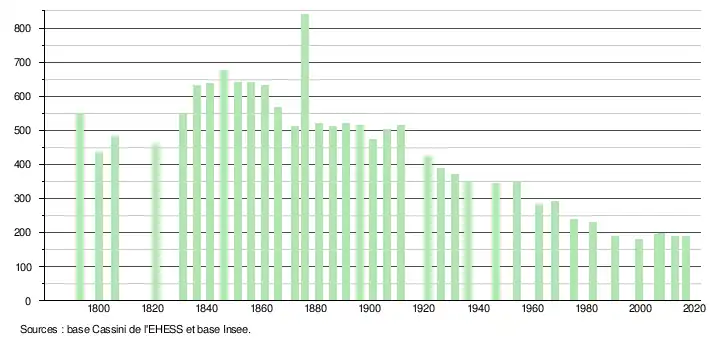 L'évolution du nombre d'habitants est connue à travers les recensements de la population effectués dans la commune depuis 1793. Pour les communes de moins de 10 000 habitants, une enquête de recensement portant sur toute la population est réalisée tous les cinq ans, les populations de référence des années intermédiaires étant quant à elles estimées par interpolation ou extrapolation[3]. Pour la commune, le premier recensement exhaustif entrant dans le cadre du nouveau dispositif a été réalisé en 2007[4].