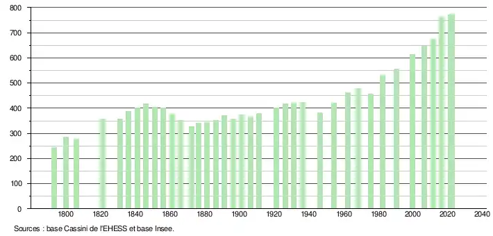 L'évolution du nombre d'habitants est connue à travers les recensements de la population effectués dans la commune depuis 1793. Pour les communes de moins de 10 000 habitants, une enquête de recensement portant sur toute la population est réalisée tous les cinq ans, les populations de référence des années intermédiaires étant quant à elles estimées par interpolation ou extrapolation[27]. Pour la commune, le premier recensement exhaustif entrant dans le cadre du nouveau dispositif a été réalisé en 2006[28].