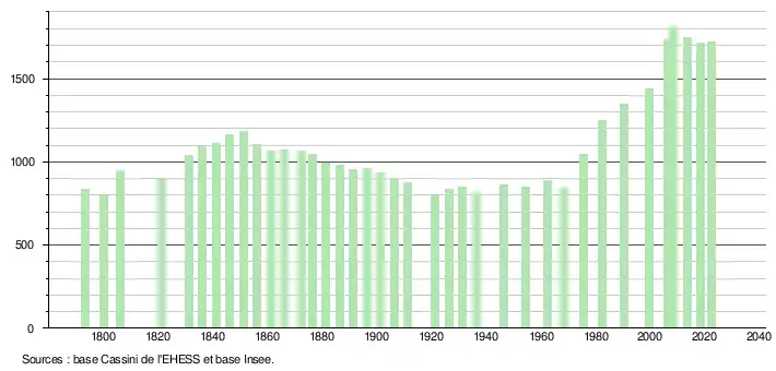 L'évolution du nombre d'habitants est connue à travers les recensements de la population effectués dans la commune depuis 1793. Pour les communes de moins de 10 000 habitants, une enquête de recensement portant sur toute la population est réalisée tous les cinq ans, les populations de référence des années intermédiaires étant quant à elles estimées par interpolation ou extrapolation[20]. Pour la commune, le premier recensement exhaustif entrant dans le cadre du nouveau dispositif a été réalisé en 2008[21].