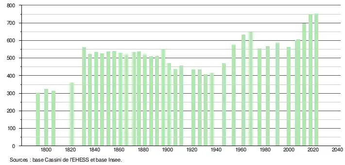 L'évolution du nombre d'habitants est connue à travers les recensements de la population effectués dans la commune depuis 1793. Pour les communes de moins de 10 000 habitants, une enquête de recensement portant sur toute la population est réalisée tous les cinq ans, les populations de référence des années intermédiaires étant quant à elles estimées par interpolation ou extrapolation[28]. Pour la commune, le premier recensement exhaustif entrant dans le cadre du nouveau dispositif a été réalisé en 2007[29].