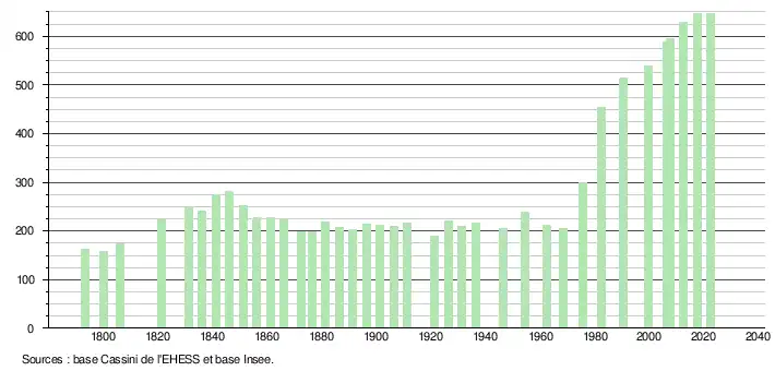 L'évolution du nombre d'habitants est connue à travers les recensements de la population effectués dans la commune depuis 1793. Pour les communes de moins de 10 000 habitants, une enquête de recensement portant sur toute la population est réalisée tous les cinq ans, les populations de référence des années intermédiaires étant quant à elles estimées par interpolation ou extrapolation[30]. Pour la commune, le premier recensement exhaustif entrant dans le cadre du nouveau dispositif a été réalisé en 2007[31].
