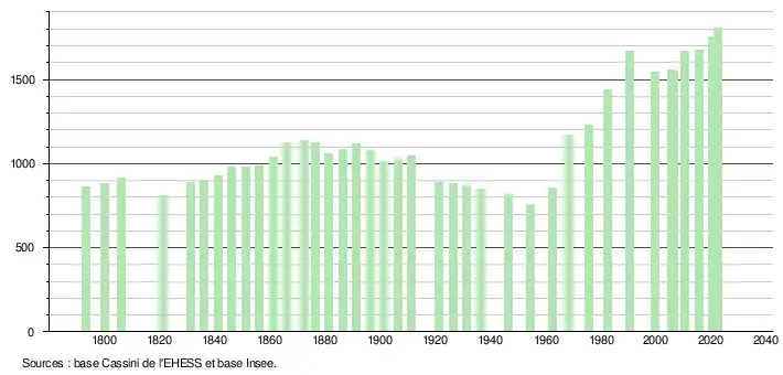 L'évolution du nombre d'habitants est connue à travers les recensements de la population effectués dans la commune depuis 1793. Pour les communes de moins de 10 000 habitants, une enquête de recensement portant sur toute la population est réalisée tous les cinq ans, les populations de référence des années intermédiaires étant quant à elles estimées par interpolation ou extrapolation[22]. Pour la commune, le premier recensement exhaustif entrant dans le cadre du nouveau dispositif a été réalisé en 2005[23].