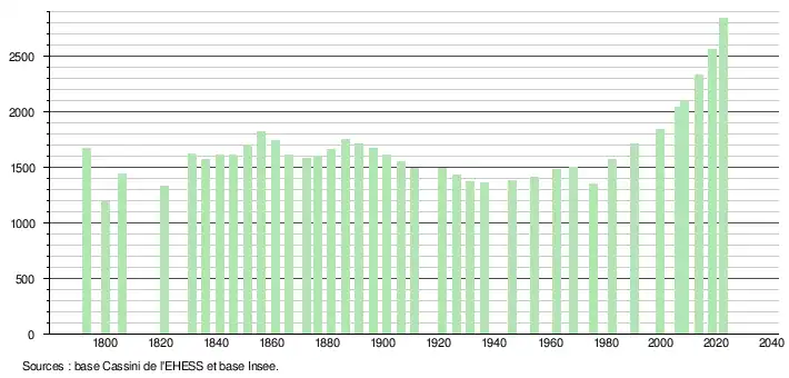 L'évolution du nombre d'habitants est connue à travers les recensements de la population effectués dans la commune depuis 1793. Pour les communes de moins de 10 000 habitants, une enquête de recensement portant sur toute la population est réalisée tous les cinq ans, les populations de référence des années intermédiaires étant quant à elles estimées par interpolation ou extrapolation[26]. Pour la commune, le premier recensement exhaustif entrant dans le cadre du nouveau dispositif a été réalisé en 2008[27].
