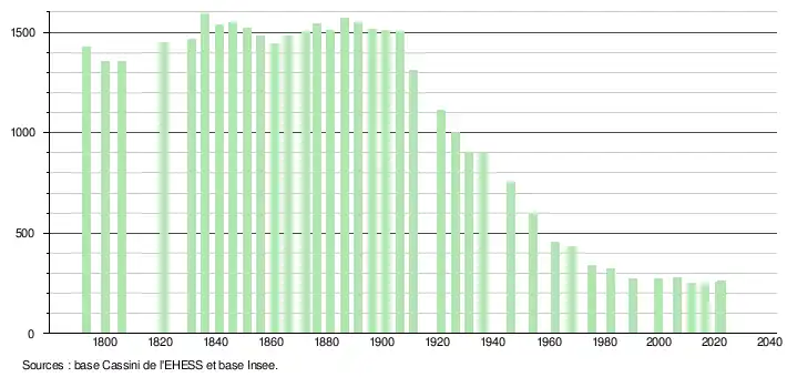 L'évolution du nombre d'habitants est connue à travers les recensements de la population effectués dans la commune depuis 1793. Pour les communes de moins de 10 000 habitants, une enquête de recensement portant sur toute la population est réalisée tous les cinq ans, les populations de référence des années intermédiaires étant quant à elles estimées par interpolation ou extrapolation[24]. Pour la commune, le premier recensement exhaustif entrant dans le cadre du nouveau dispositif a été réalisé en 2006[25].