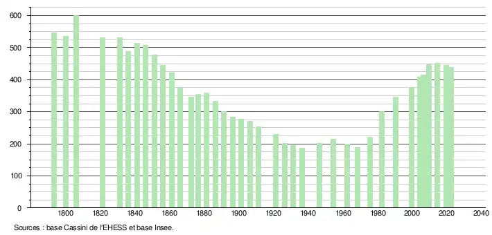 L'évolution du nombre d'habitants est connue à travers les recensements de la population effectués dans la commune depuis 1793. Pour les communes de moins de 10 000 habitants, une enquête de recensement portant sur toute la population est réalisée tous les cinq ans, les populations de référence des années intermédiaires étant quant à elles estimées par interpolation ou extrapolation[17]. Pour la commune, le premier recensement exhaustif entrant dans le cadre du nouveau dispositif a été réalisé en 2004[18].