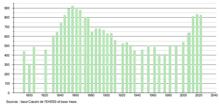 L'évolution du nombre d'habitants est connue à travers les recensements de la population effectués dans la commune depuis 1793. Pour les communes de moins de 10 000 habitants, une enquête de recensement portant sur toute la population est réalisée tous les cinq ans, les populations de référence des années intermédiaires étant quant à elles estimées par interpolation ou extrapolation[24]. Pour la commune, le premier recensement exhaustif entrant dans le cadre du nouveau dispositif a été réalisé en 2007[25].
