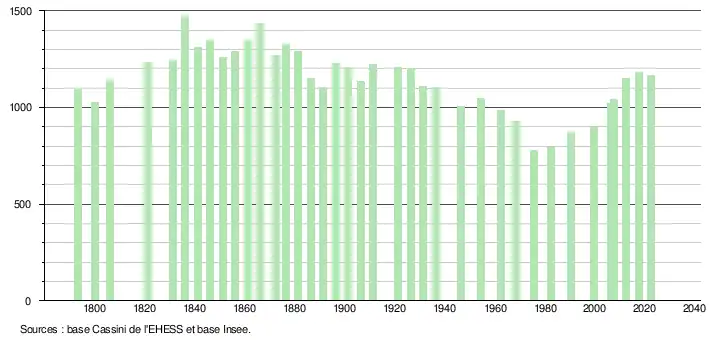 L'évolution du nombre d'habitants est connue à travers les recensements de la population effectués dans la commune depuis 1793. Pour les communes de moins de 10 000 habitants, une enquête de recensement portant sur toute la population est réalisée tous les cinq ans, les populations de référence des années intermédiaires étant quant à elles estimées par interpolation ou extrapolation[13]. Pour la commune, le premier recensement exhaustif entrant dans le cadre du nouveau dispositif a été réalisé en 2007[14].