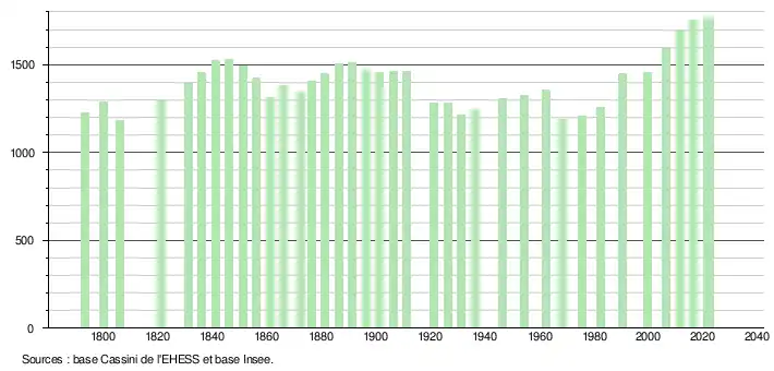 L'évolution du nombre d'habitants est connue à travers les recensements de la population effectués dans la commune depuis 1793. Pour les communes de moins de 10 000 habitants, une enquête de recensement portant sur toute la population est réalisée tous les cinq ans, les populations de référence des années intermédiaires étant quant à elles estimées par interpolation ou extrapolation[25]. Pour la commune, le premier recensement exhaustif entrant dans le cadre du nouveau dispositif a été réalisé en 2006[26].