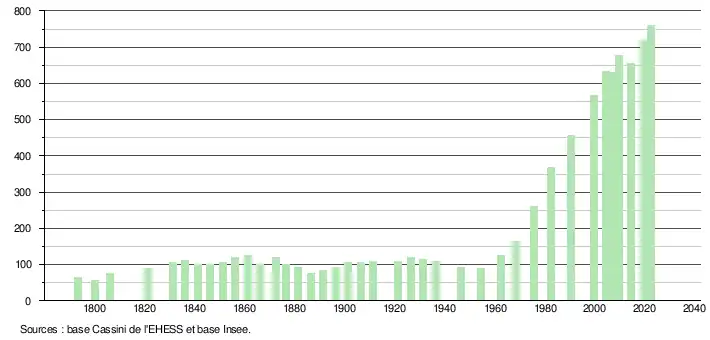 L'évolution du nombre d'habitants est connue à travers les recensements de la population effectués dans la commune depuis 1793. Pour les communes de moins de 10 000 habitants, une enquête de recensement portant sur toute la population est réalisée tous les cinq ans, les populations de référence des années intermédiaires étant quant à elles estimées par interpolation ou extrapolation[18]. Pour la commune, le premier recensement exhaustif entrant dans le cadre du nouveau dispositif a été réalisé en 2004[19].