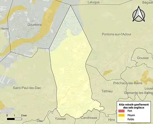 La commune fait partie du territoire à risques importants d'inondation (TRI) de Dax, regroupant 13 communes concernées par un risque de débordement de l'Adour et du Luy, un des 18 TRI qui ont été arrêtés fin 2012 sur le bassin Adour-Garonne[17]. Les événements significatifs antérieurs à 2014 sont les crues de l'Adour de 1770, 1879, 1952, 1981 et 2014. La crue du est la plus forte crue enregistrée. La crue de février 1952 constitue quant à elle la crue de référence sur de nombreux secteurs du bassin de l’Adour. Des cartes des surfaces inondables ont été établies pour trois scénarios : fréquent (crue de temps de retour de 10 ans à 30 ans), moyen (temps de retour de 100 ans à 300 ans) et extrême (temps de retour de l'ordre de 1 000 ans, qui met en défaut tout système de protection)[18]. La commune a été reconnue en état de catastrophe naturelle au titre des dommages causés par les inondations et coulées de boue survenues en 1999, 2009, 2014, 2020 et 2021 et au titre des inondations par remontée de nappe en 2020[19],[15].