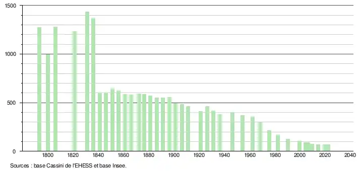 L'évolution du nombre d'habitants est connue à travers les recensements de la population effectués dans la commune depuis 1793. Pour les communes de moins de 10 000 habitants, une enquête de recensement portant sur toute la population est réalisée tous les cinq ans, les populations de référence des années intermédiaires étant quant à elles estimées par interpolation ou extrapolation[15]. Pour la commune, le premier recensement exhaustif entrant dans le cadre du nouveau dispositif a été réalisé en 2004[16].