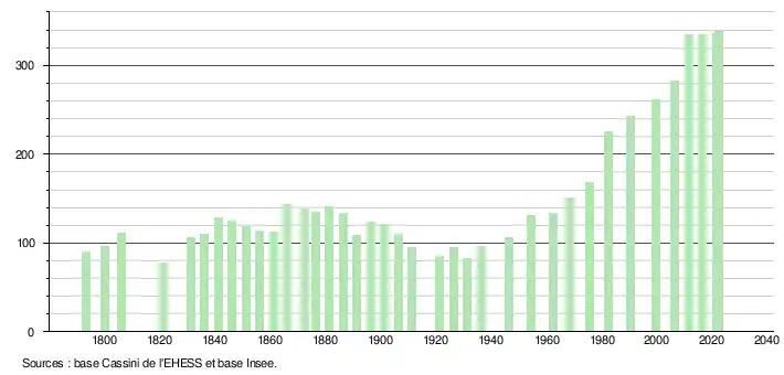 L'évolution du nombre d'habitants est connue à travers les recensements de la population effectués dans la commune depuis 1793. Pour les communes de moins de 10 000 habitants, une enquête de recensement portant sur toute la population est réalisée tous les cinq ans, les populations de référence des années intermédiaires étant quant à elles estimées par interpolation ou extrapolation[18]. Pour la commune, le premier recensement exhaustif entrant dans le cadre du nouveau dispositif a été réalisé en 2006[19].