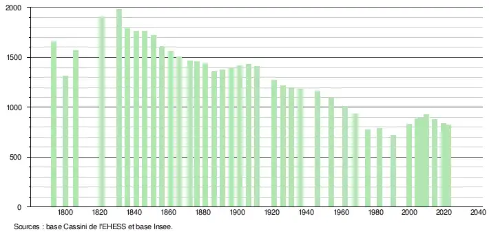 L'évolution du nombre d'habitants est connue à travers les recensements de la population effectués dans la commune depuis 1793. Pour les communes de moins de 10 000 habitants, une enquête de recensement portant sur toute la population est réalisée tous les cinq ans, les populations de référence des années intermédiaires étant quant à elles estimées par interpolation ou extrapolation[15]. Pour la commune, le premier recensement exhaustif entrant dans le cadre du nouveau dispositif a été réalisé en 2004[16].